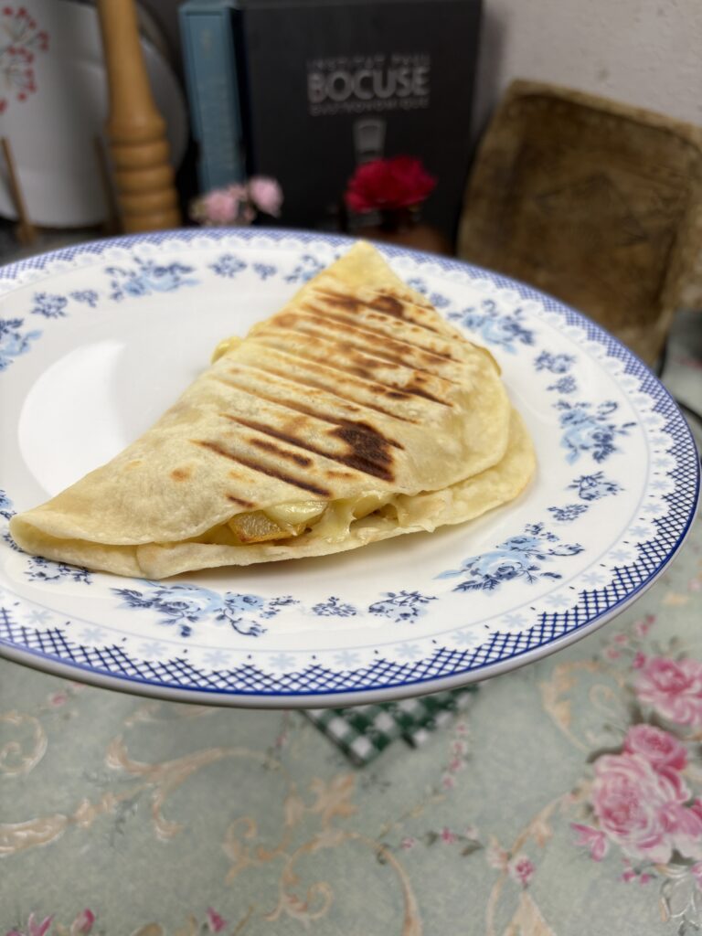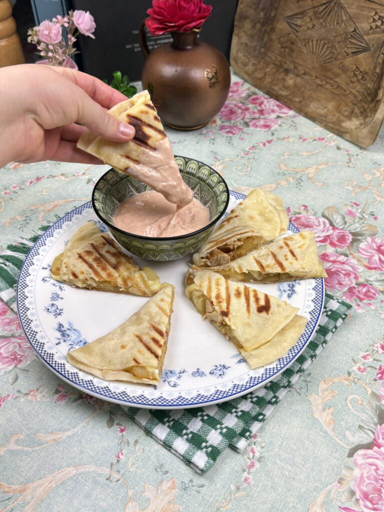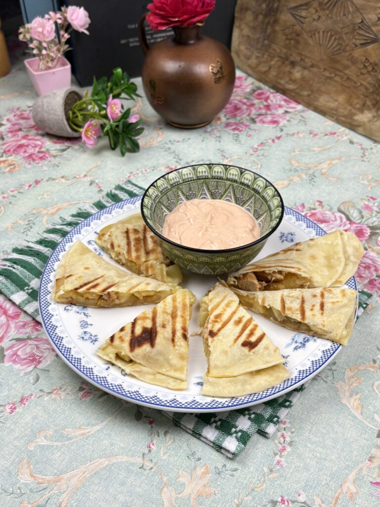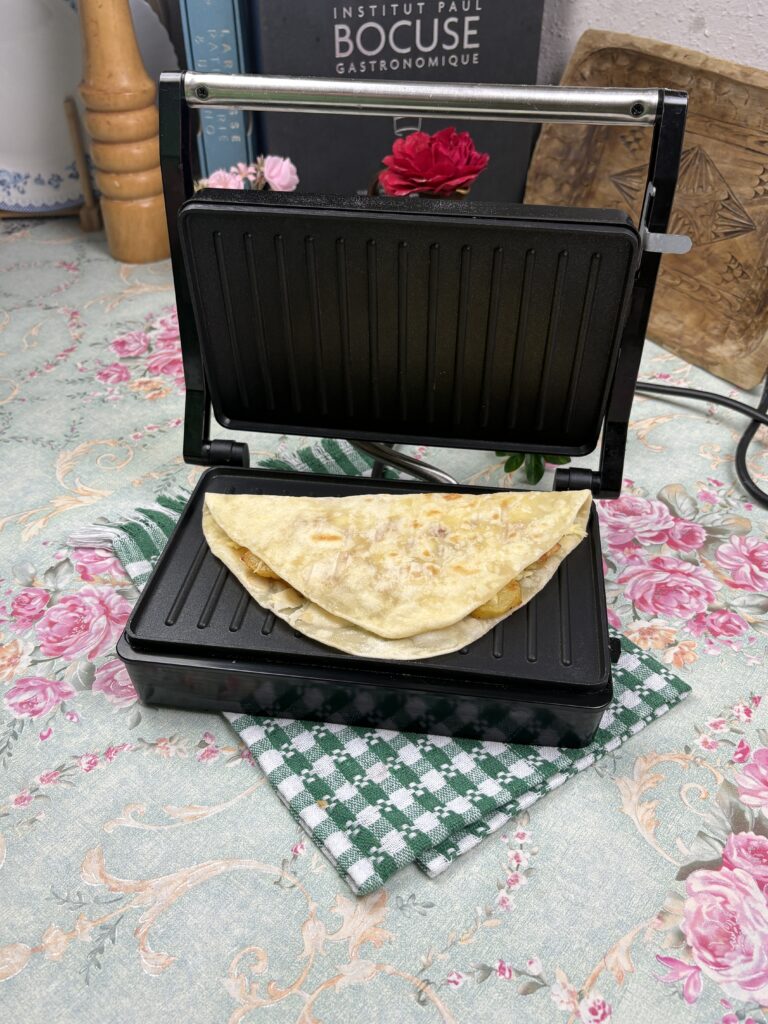 • Luați lipiile calde și pufoase, asigurându-vă că sunt proaspăt coapte pentru a-și păstra textura moale și flexibilă. Adăugați în fiecare lipie o porție generoasă de pui fript, tăiat în fâșii subțiri, asezonat cu condimente aromate, împreună cu cartofi prăjiți crocanți, care aduc un contrast plăcut de texturi. Nu uitați să încorporați cascavalul ras, care se va topi perfect și va crea o senzație de gust bogat și cremos. Așezați cu grijă lipiile umplute în aparatul de sandvișuri, lăsându-le acolo timp de câteva minute. Veți observa cum căldura va începe să topească cascavalul, transformându-l într-o umplutură delicioasă și lipicioasă care va îmbina toate ingredientele într-o gustare de neuitat.