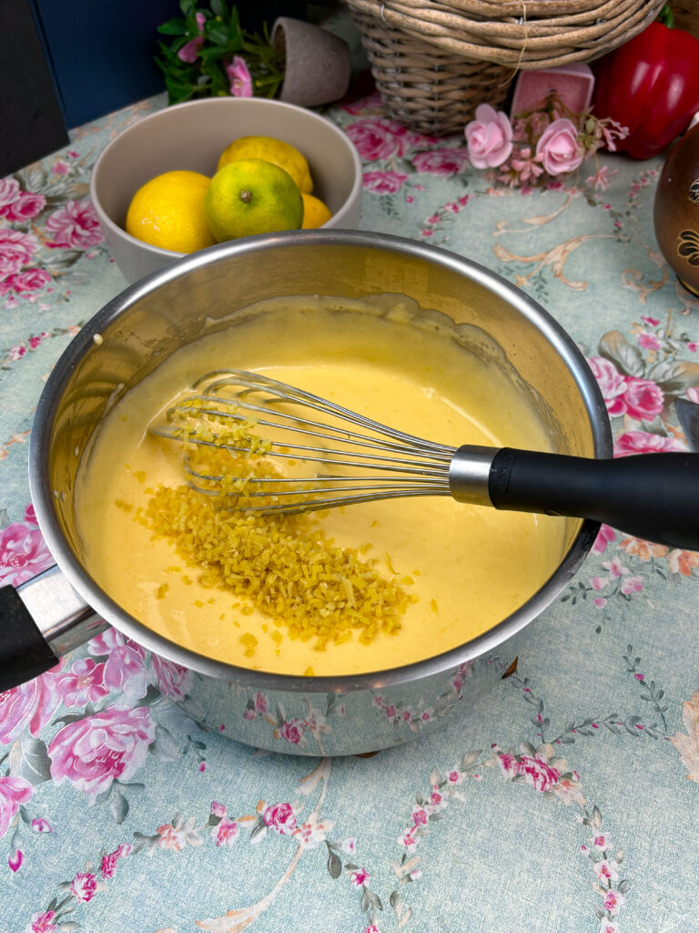 2. Adăugarea ouălor și coaja de lămâie:După ce ați combinat ingredientele lichide, adăugați încet ouăle bătute și gălbenușurile în cratiță, amestecând continuu cu un tel sau un tel de mână. Este esențial să amestecați constant pentru a preveni coagularea ouălor. La acest moment, adăugați și coaja de lămâie fiartă de cele trei ori, pe care ați pregătit-o la pasul anterior. Coaja adaugă o notă intensă de aromă ce completează perfect gustul acrișor al zeamei de lămâie.